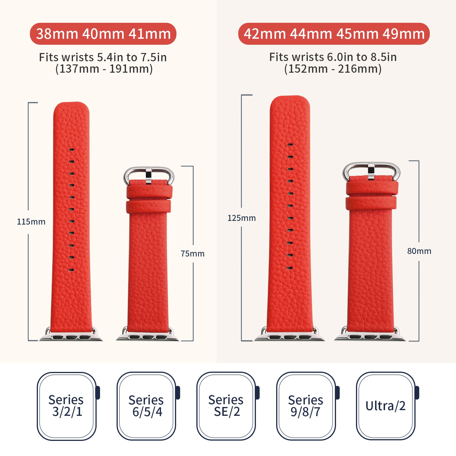 - PERFECT FIT with iWATCH BAND: Apple watch bands 42mm(Series 10) 41mm 40mm 38mm fit 5.4"-7.5" (137mm-190mm) wrists, 42mm(Series 3) 44mm 45mm 46mm 49mm iwatch bands fit 6.0"-8.5"(152-215mm) wrists, suitable for both men and women. You can adjust the length of the apple watch leather strap according to your wrist size.